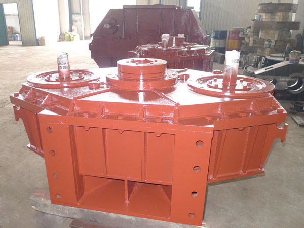 三環(huán)減速機(jī)傳動,采用行星齒輪內(nèi)嚙合方式傳遞動力。根據(jù)火車頭采用的“四桿機(jī)構(gòu)”的原理,同步旋轉(zhuǎn)二根曲軸,帶動相互平行的、嵌有內(nèi)齒輪的三只環(huán)片,在空間作平面圓周運(yùn)動,內(nèi)齒輪都圍繞一只輸出軸齒輪旋轉(zhuǎn),呈現(xiàn)“多層齒圈”圍繞一個中心輪、作行星式“流轉(zhuǎn)嚙合”的布局。